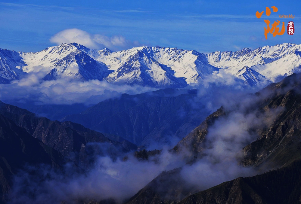 湛蓝的天空下祁连雪峰银装素裹,峰峦间云雾缭绕,秋意蔓延。群山莽莽,天地一色,展现出祁连山独有的雄浑和壮美。