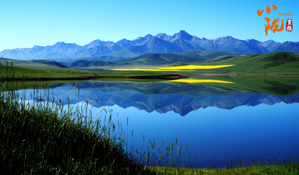 西大河水库碧亮赐透,宛若草地上镶嵌的蓝宝石,远处的牛羊、油菜花和壮丽的祁连山倒影水中,像一幅水彩画。