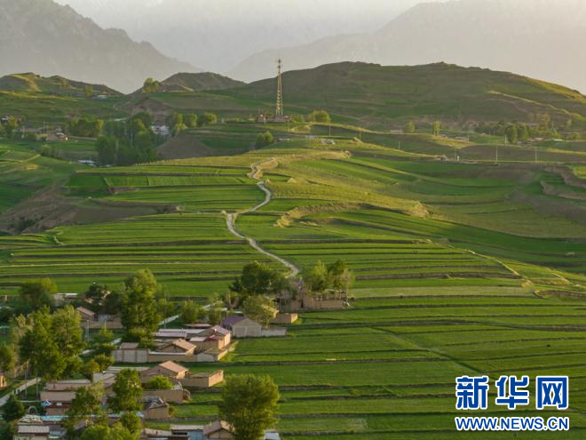 夏日,位于祁连山下的甘肃省张掖市民乐县丰乐镇易家湾村绿意盎然。民居与田园交错,形成一幅天然的美丽画卷。新华网发(吴开春 摄)