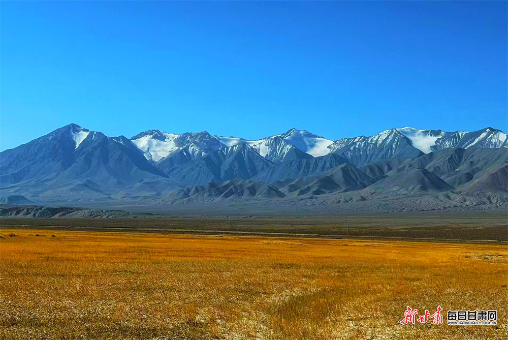 远处,皑皑雪山如圣洁的背景板矗立天际,与脚下的金色草原形成鲜明而和谐的色彩碰撞。藏原羚、野牦牛等野生动物不时在草原上漫步、觅食,灵动身影与自然景致相映成趣,勾勒出一幅兼具生态之美与野趣之韵的秋日图景,让肃北的秋更显鲜活动人。
