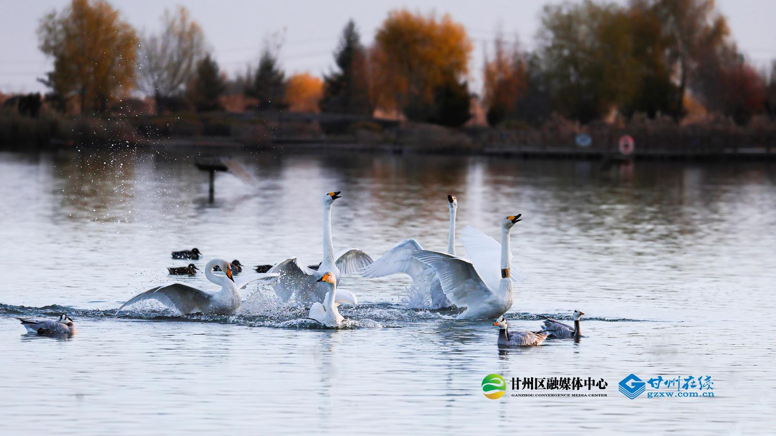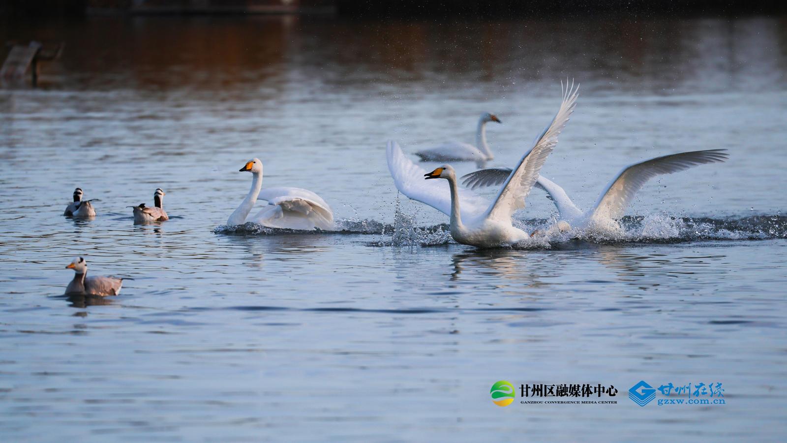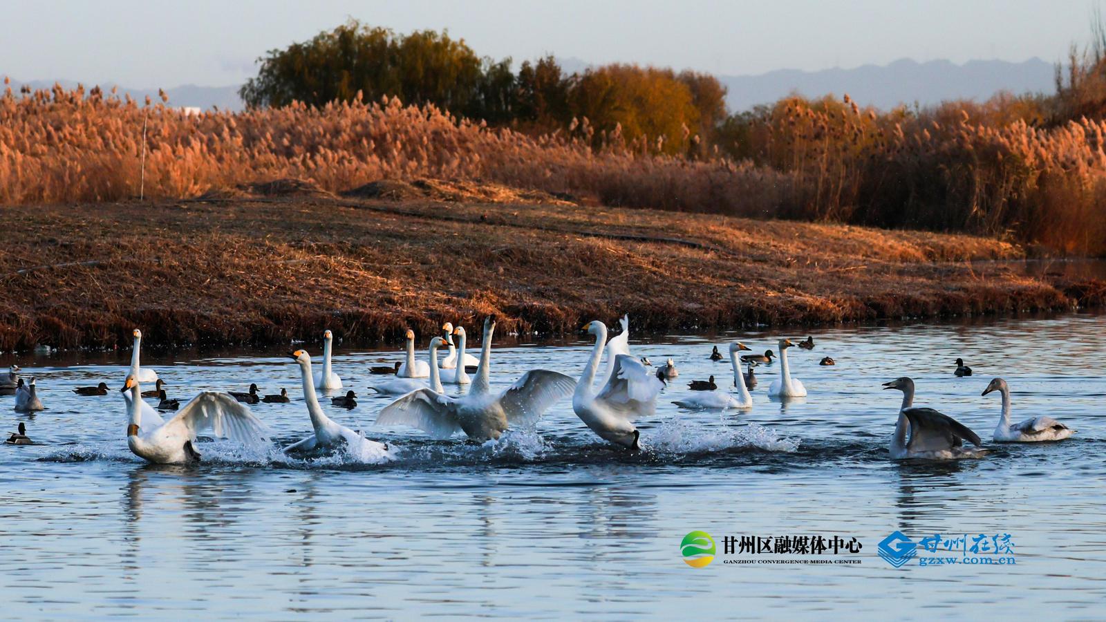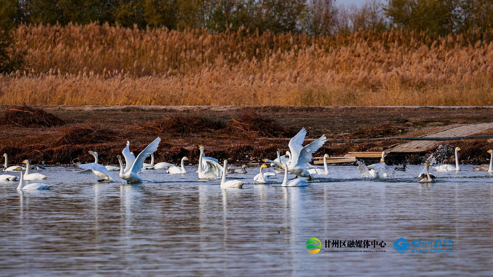 张掖湿地迎来“冬日客” 成群白天鹅翩翩而至