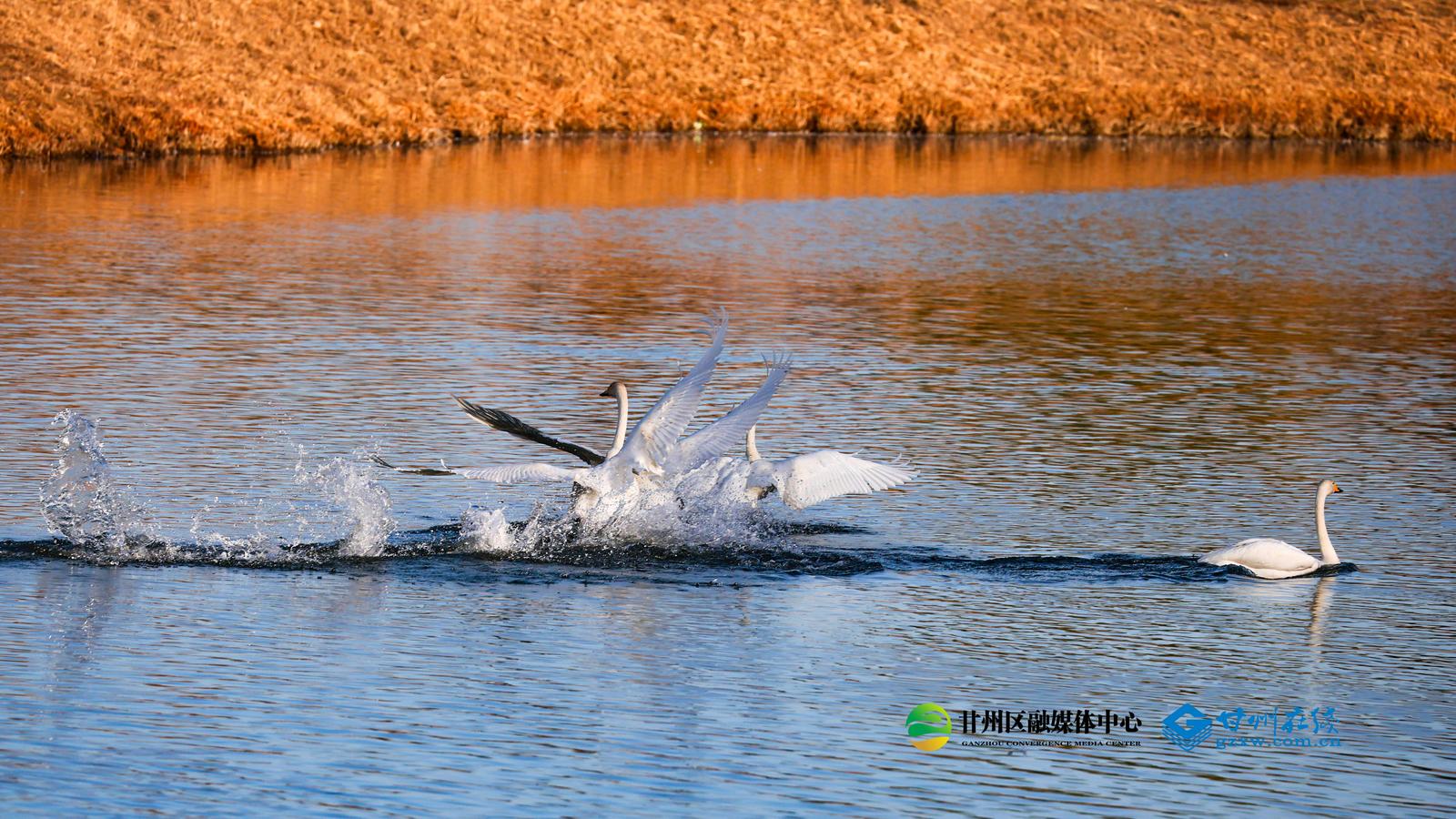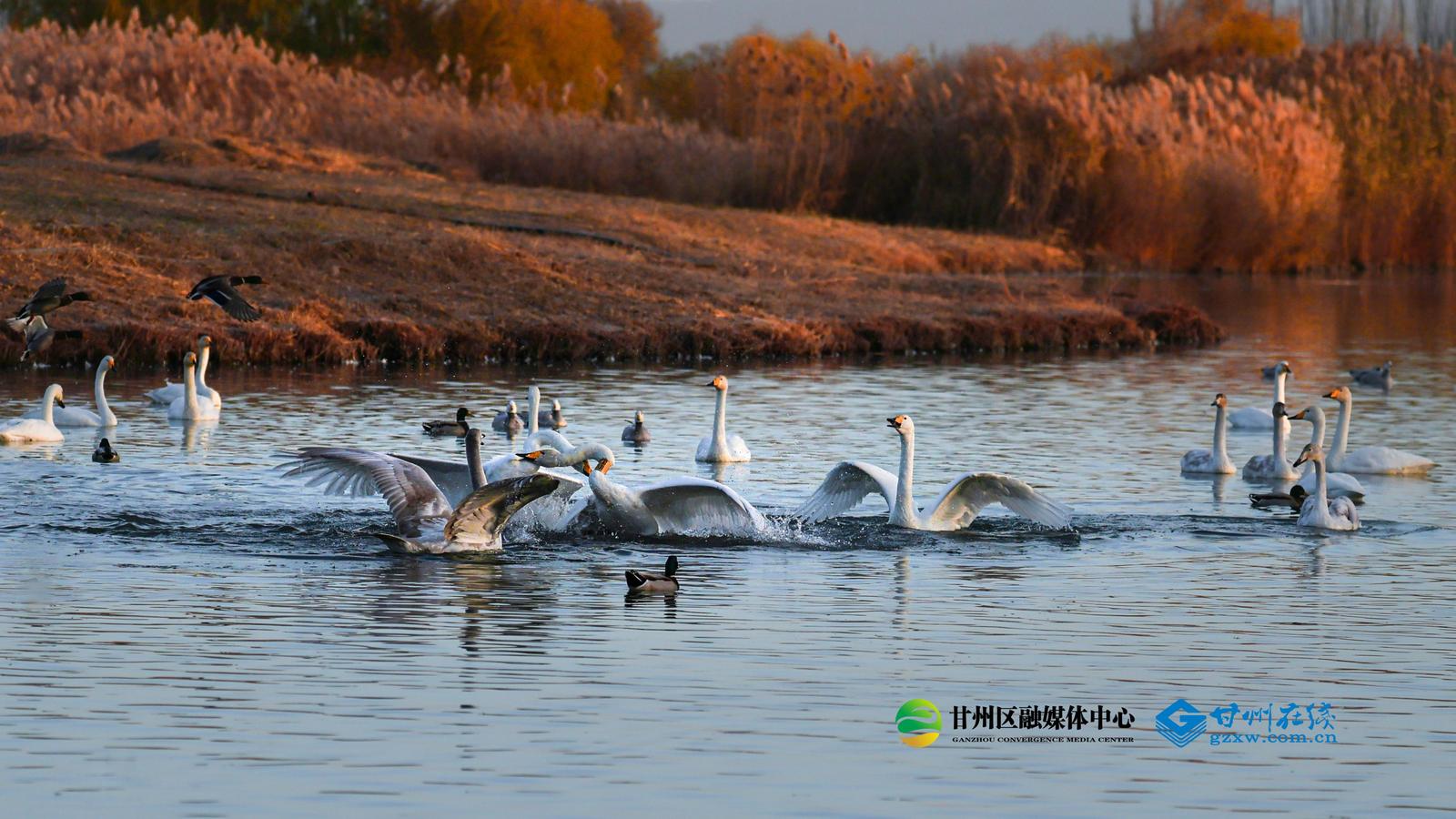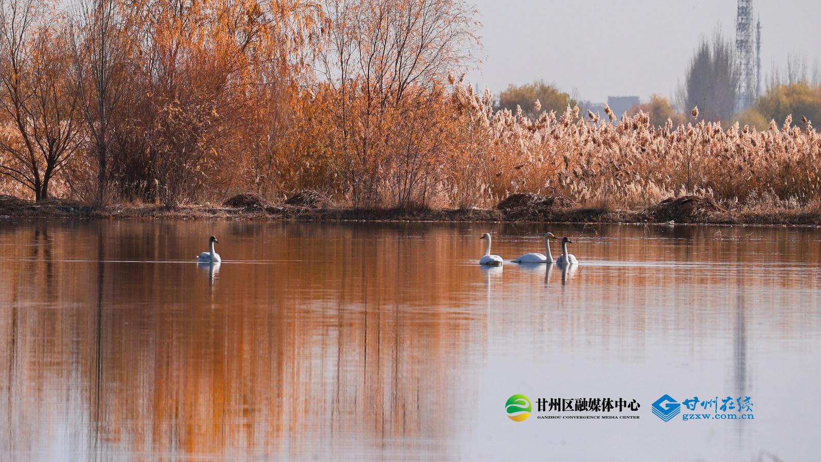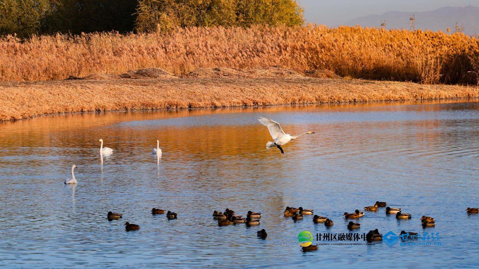 张掖湿地迎来“冬日客” 成群白天鹅翩翩而至