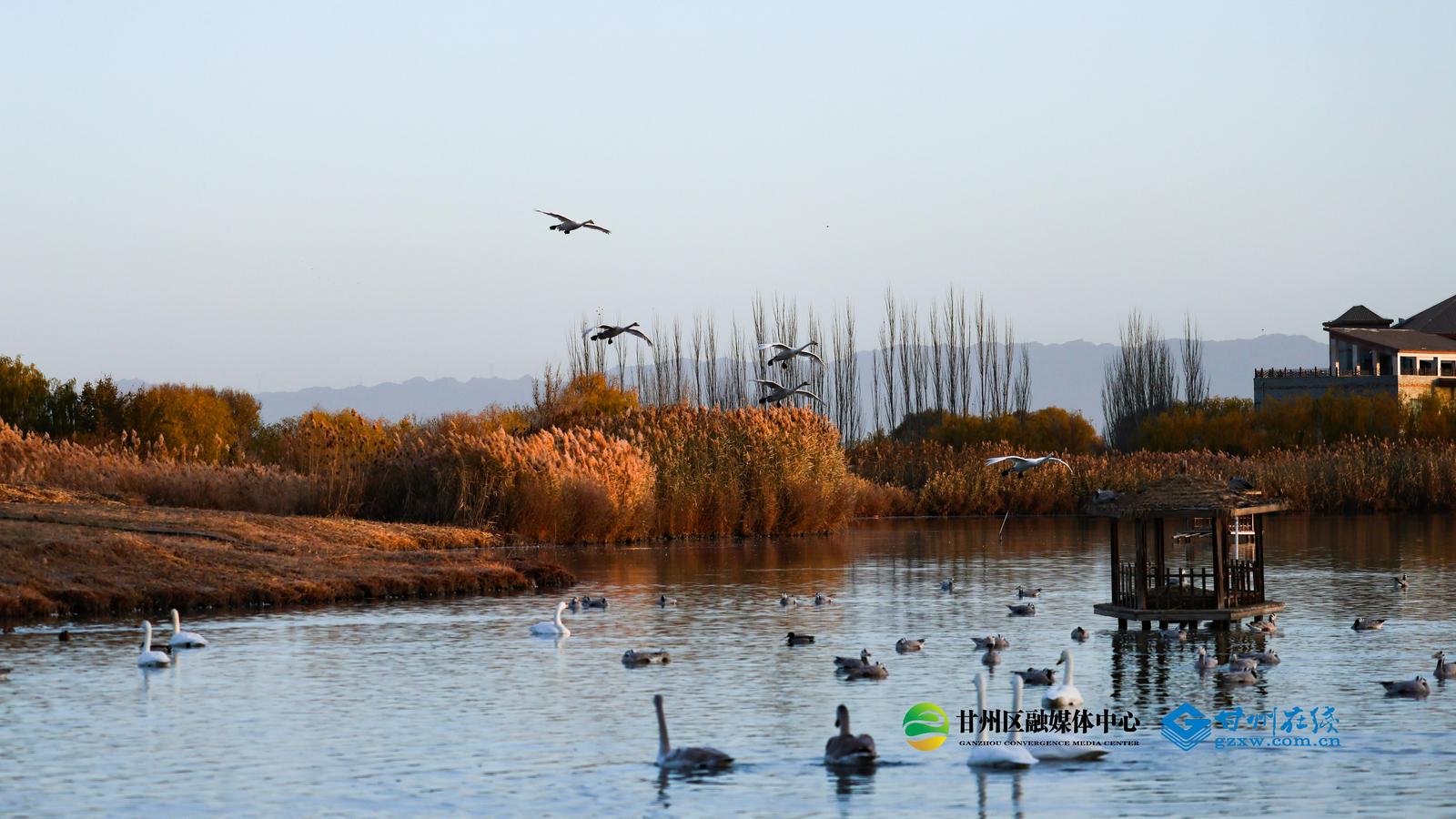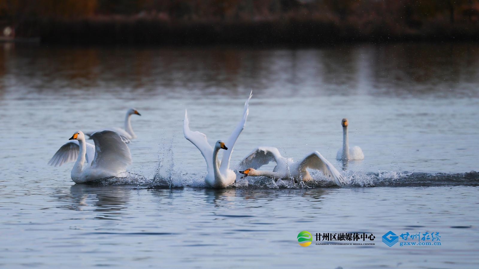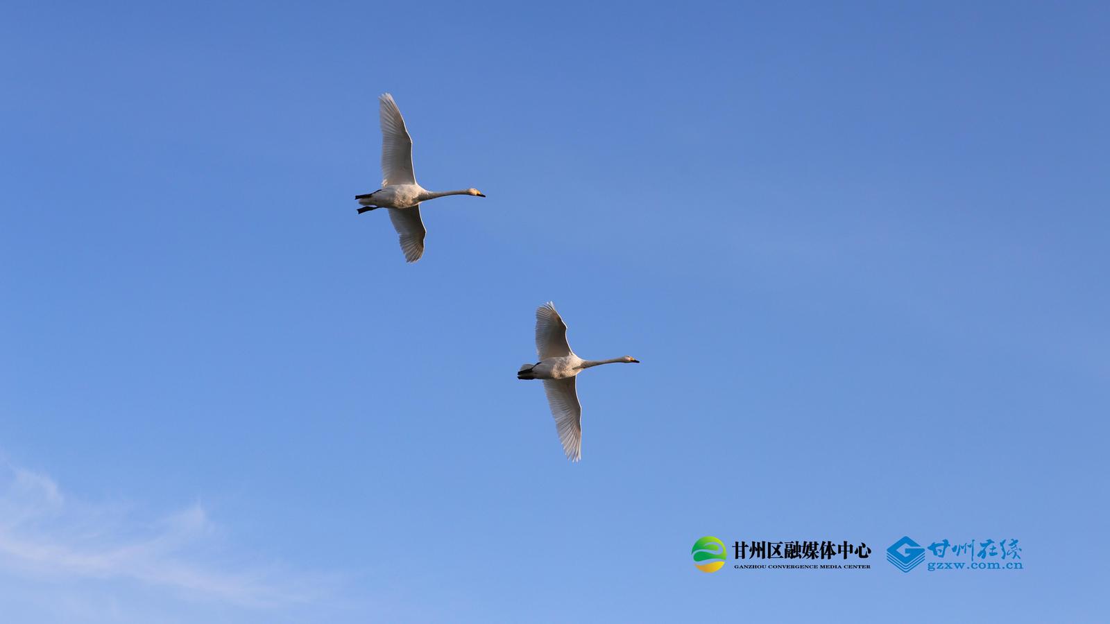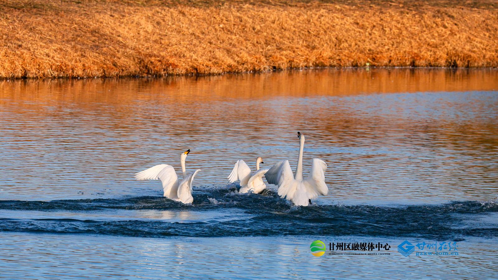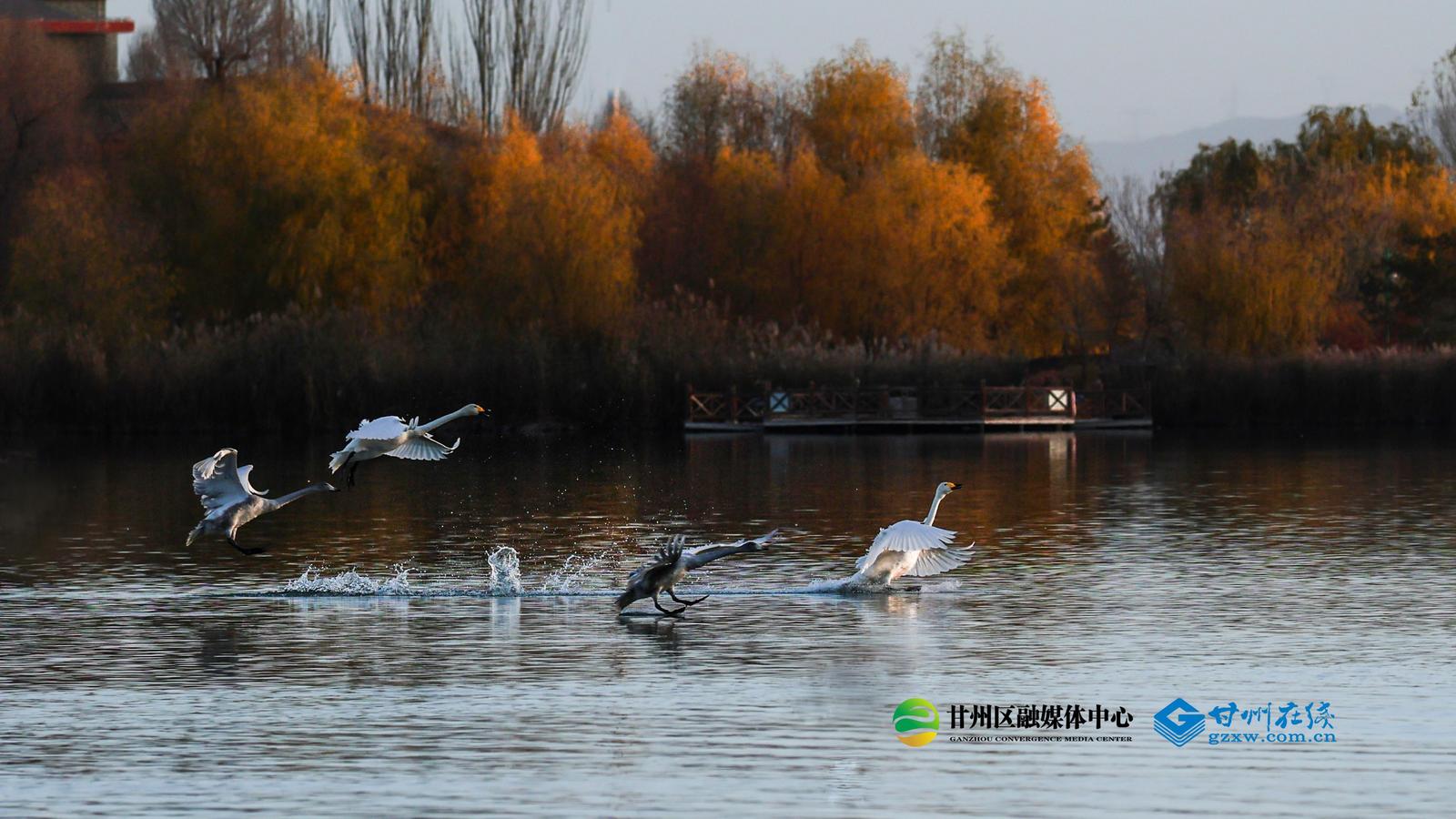 张掖湿地迎来“冬日客” 成群白天鹅翩翩而至