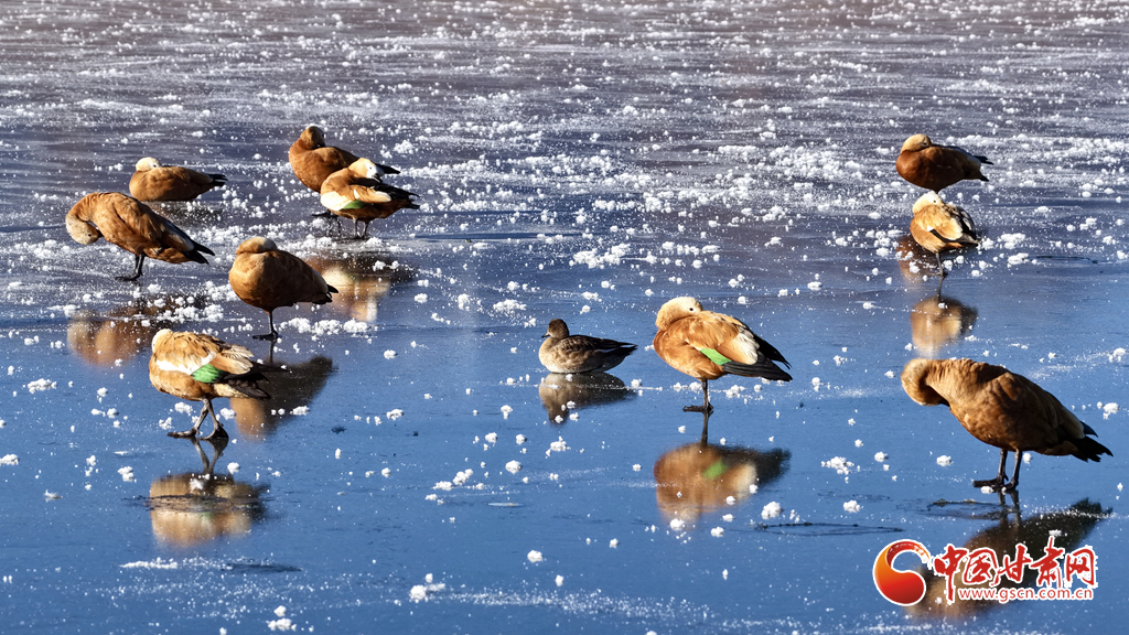 11月18日,初冬的甘肃山丹马场鸾鸟湖湿地上,赤麻鸭、大天鹅、大白鹭三种珍稀鸟类悠然共处。它们或于冰面踱步,或在湖中游弋,或于浅滩伫立,共同构成了湿地生态持续向好的生动图景。