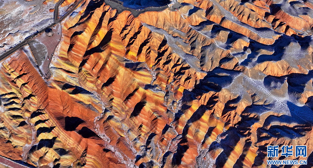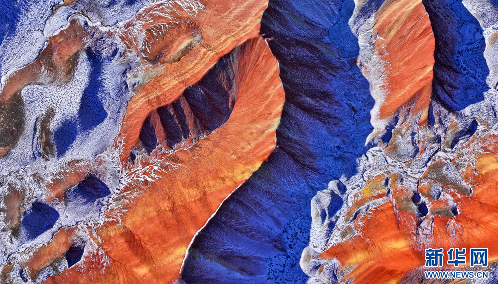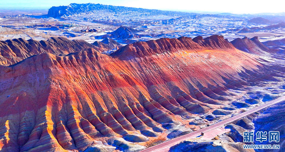 近日,地处甘肃省张掖市的张掖七彩丹霞旅游景区迎来降雪。白雪宛如轻纱般覆盖在丹霞上,构成了一幅色彩斑斓的水彩画卷,尽显“雪浴丹霞”的独特美景。新华网发(王将 摄)