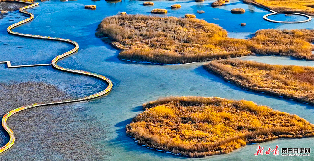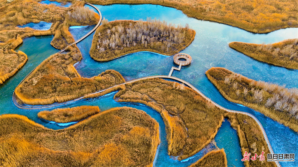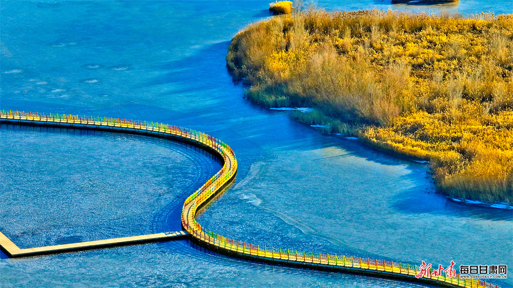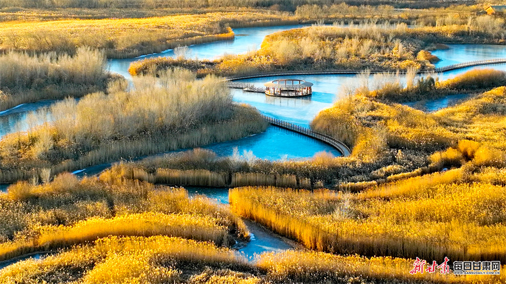 12月4日,张掖市黑河湿地国家级自然保护区,芦苇、蒲草经风霜洗礼尽数换上“金甲”。高空俯瞰,夕阳下的芦苇荡宛如金色海洋,芦花随风轻舞,周边碧水凝冰,恰似一幅徐徐铺展的金色画卷,吸引大批游客与摄影爱好者慕名而来。