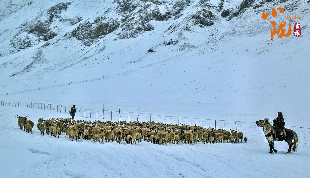 天地一色,万物寂静,风雪牧归。牧民在雪地里放牧牛羊,人和羊在白雪覆盖的草原上共同演绎着生活的乐章。