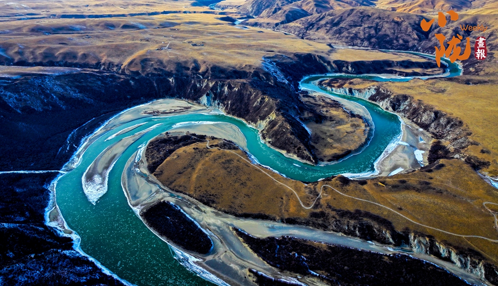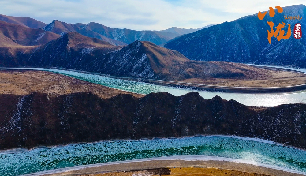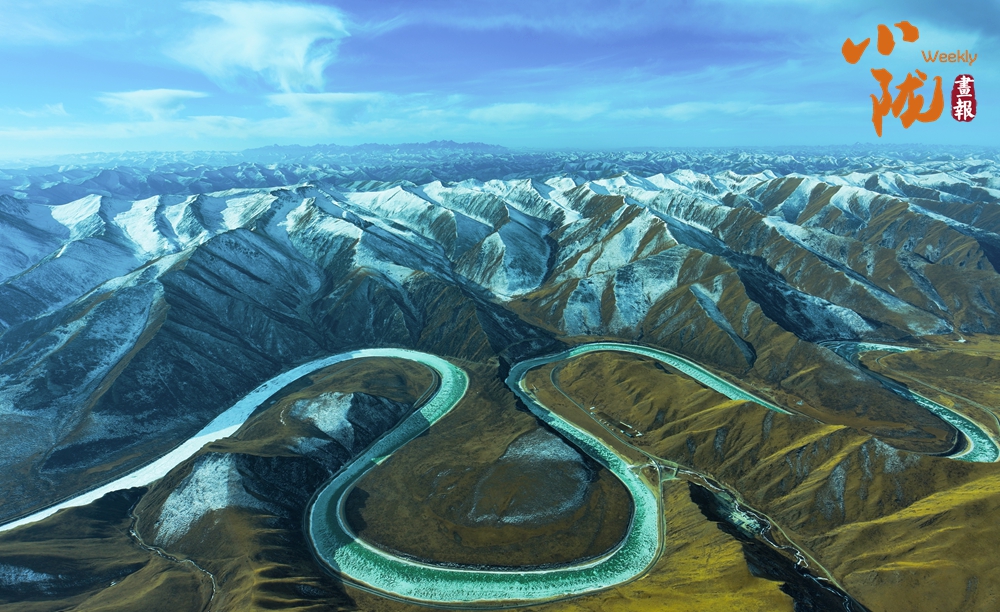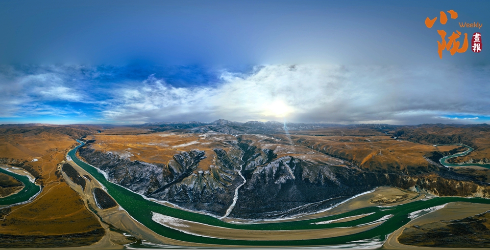 白雪皑皑的山梁、斗折蛇行的黄河,在阳光下闪耀着金色的光芒,显得格外耀眼和温暖。