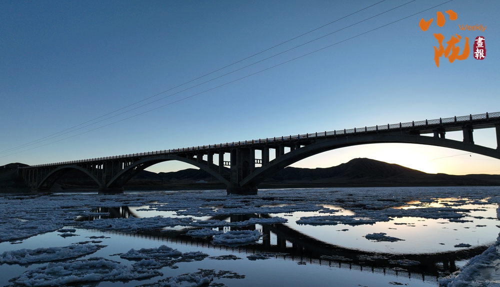 夕阳西下,冰凌随着河水顺流而下,互相碰撞,犹如珍珠玛瑙般璀璨,镶嵌在母亲河的怀抱之中。