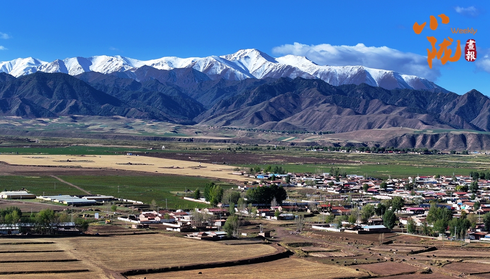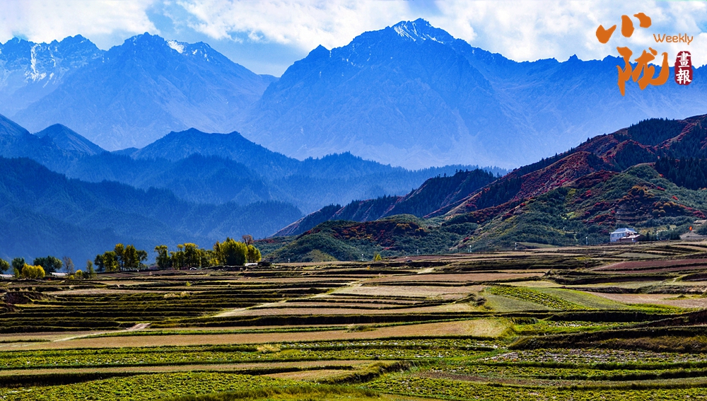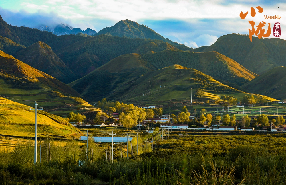 秋风温柔,山川壮美。祁连山脚下,泛黄的草原如同大地铺开的地毯,伸向天际。远处的山川,近处的村庄、树木沉浸在金色的光芒中,一幅五彩斑斓的秋景图。