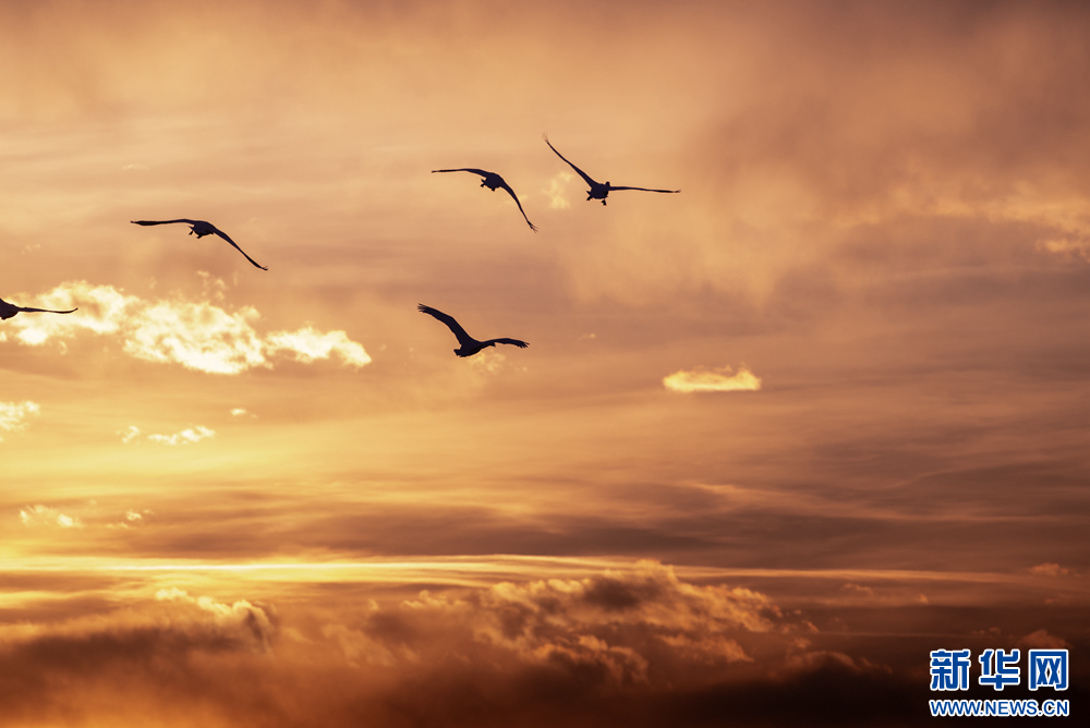 冬日的白天鹅在甘肃张掖国家湿地公园的夕阳下翩翩起舞,此起彼伏的鸣唱,柔美的身姿,在阳光里揉成一副金色画卷。新华网发(刘旭明 摄)